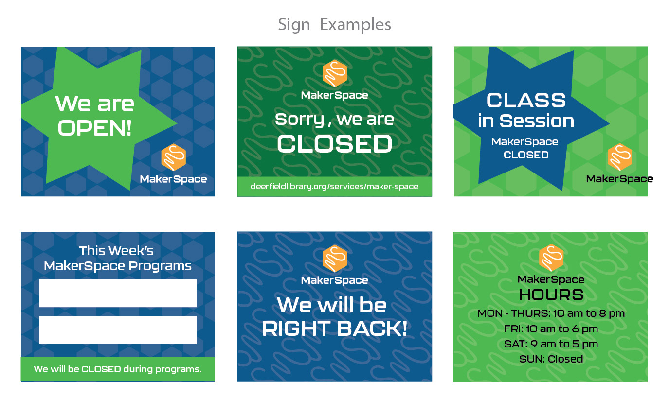 Within my first few months at Deerfield Public Library, I developed and implemented a full branding identity for the Library’s MakerSpace. Previous attempts by the Communications Department had failed to resonate with staff, leaving the space without a cohesive visual identity. After listening to feedback and learning about the MakerSpace’s offerings, I created a logo and brand system that immediately gained enthusiastic support from the team.