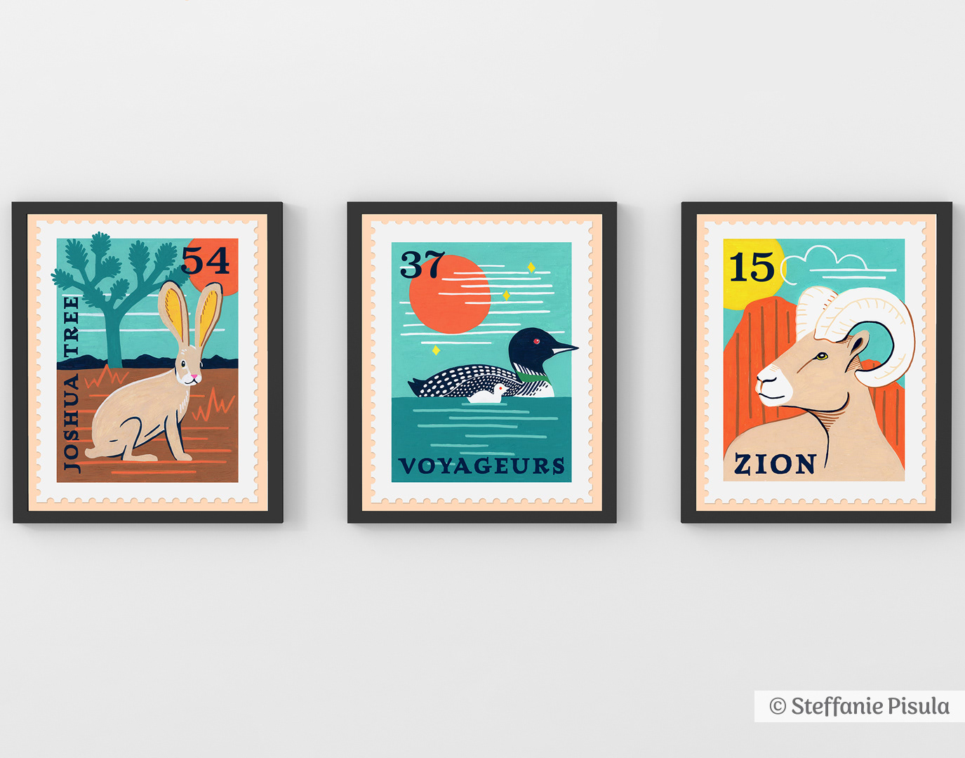 The Joshua Tree Jack Rabbit, Voyageurs Loon, and Zion Bighorn Sheep are part of my National Park Animal Stamp Collection.