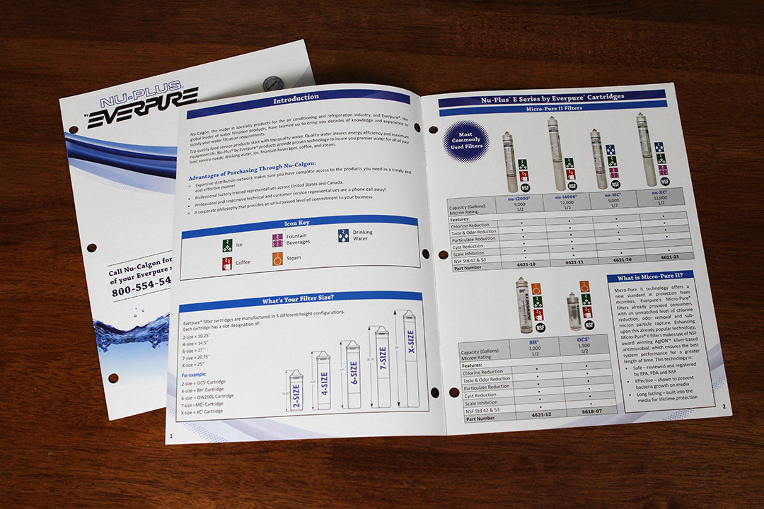 This is a small 12 page catalog that I designed for Nu-Plus by Everpure, the water filtration line at Nu-Calgon. The goal was showcase the product offering and use charts and icons to simplify the list of features for each water filter.